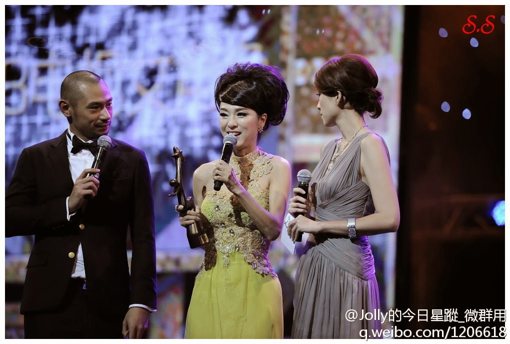 Taking Him Law's other arm, Mandy Wong once again appeared in a lime green dress.  While I liked the other one I saw her in, this one was not to my liking.  Not that the dress looks bad because I actually really love the colour and design.  Problem is it doesn't match Mandy herself.  The colour is too 'youthful'/'happy' for Mandy, who I think would be better off with cooler colours.  Also cause the hair didn't really suit the atmosphere of the dress.  Man, I think the only style for short hair is slicking them back?  Cause it's usually like that isn't?